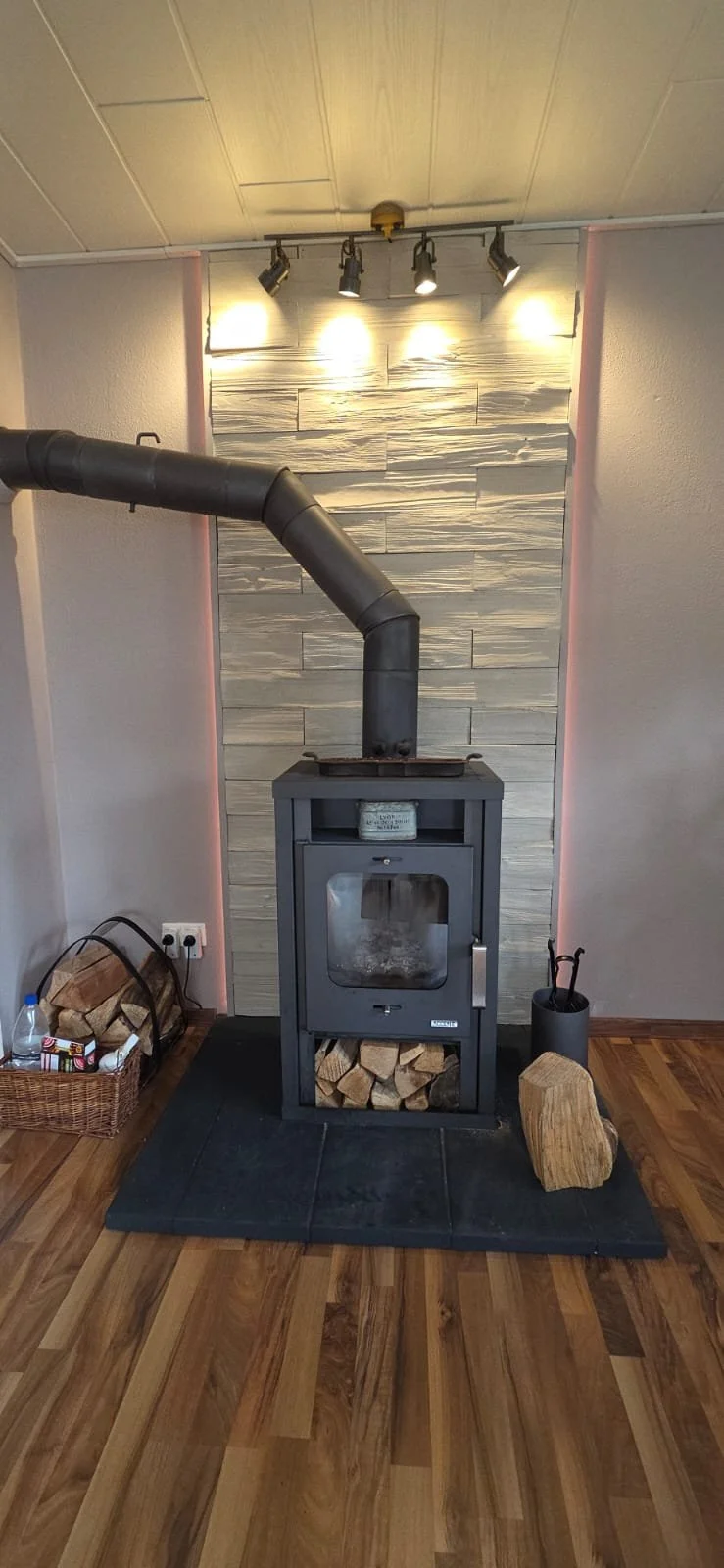 Das großzügige Wohnzimmer verfügt über einen Holzofen, große Fenster und zwei Terrassentüren, die auf die überdachte Terrasse führen.