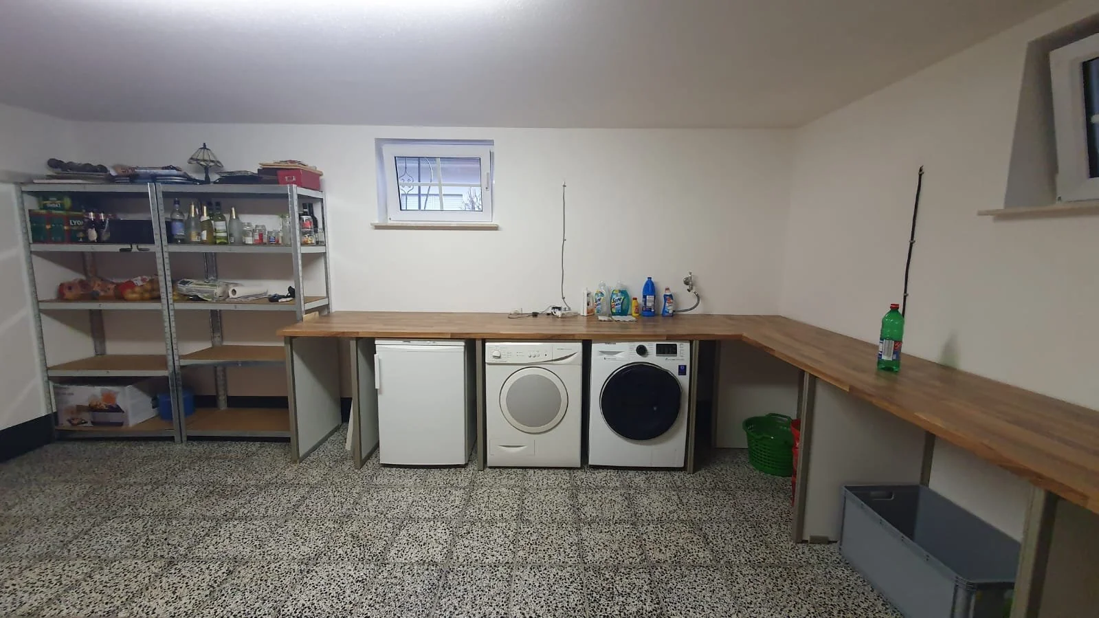 Dieser Raum dient derzeit als Abstellraum für Gartengeräte und Fahrräder. Er hat eine Tür zum Garten. Tageslicht durch das Fenster.